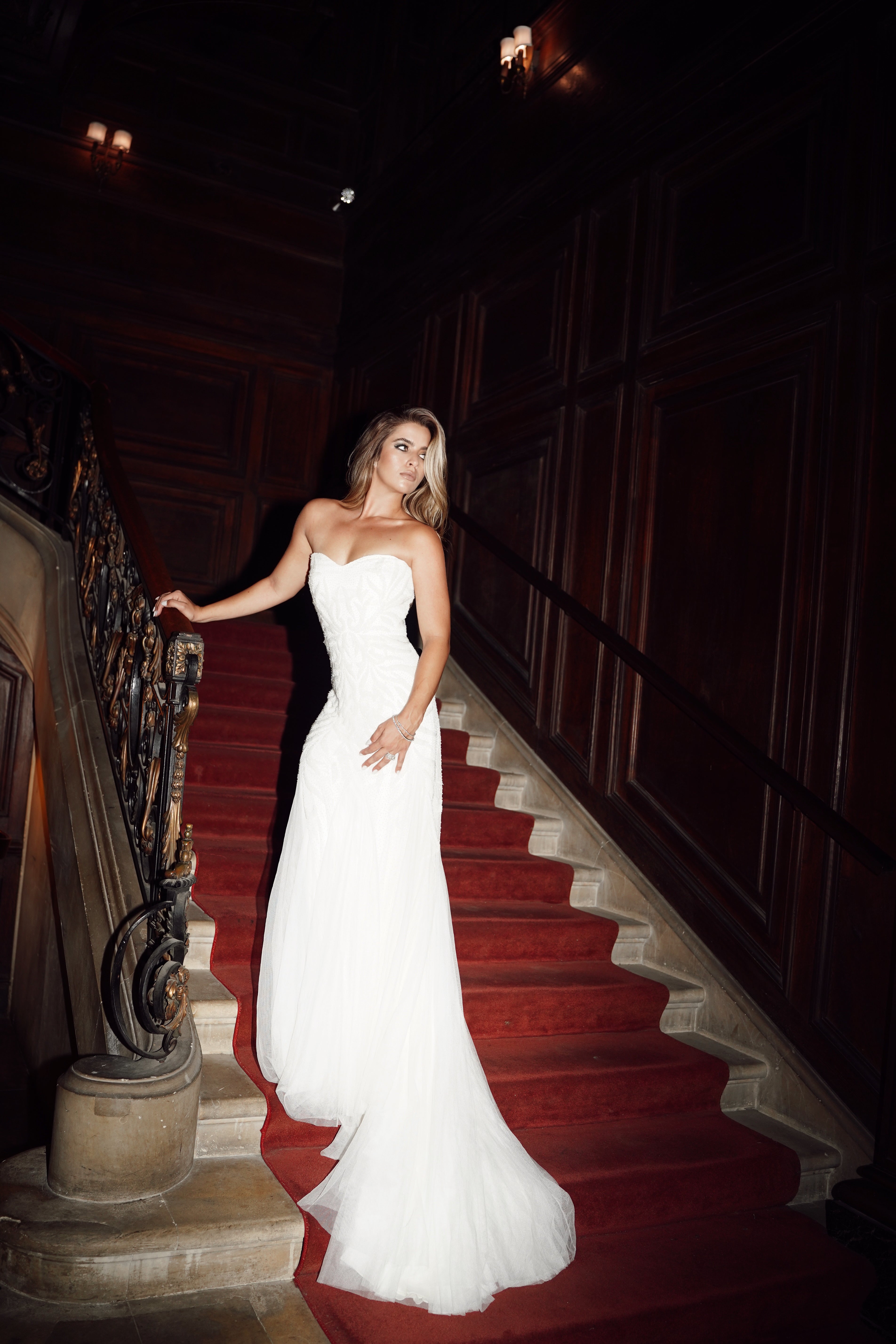 Suzanne Neville Pearl Accent Strapless Pleated Wedding Gown