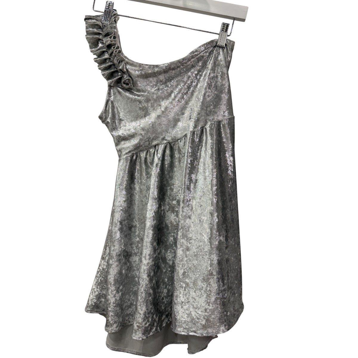 This custom one-shoulder mini dress is crafted from shimmering metallic silver fabric for a bold, modern statement. Designed to flatter with a sleek silhouette, it’s perfect for parties, nights out, and special occasions.