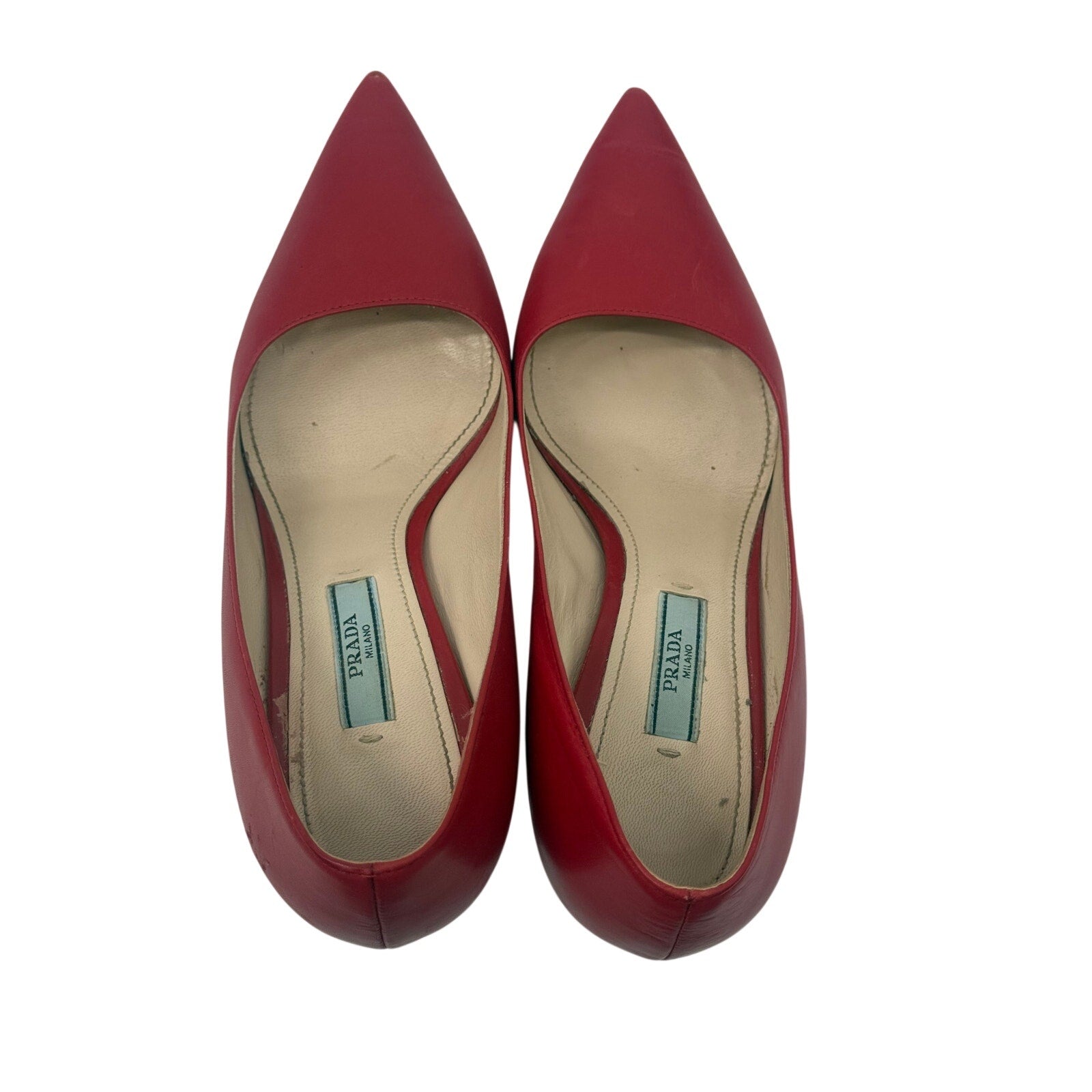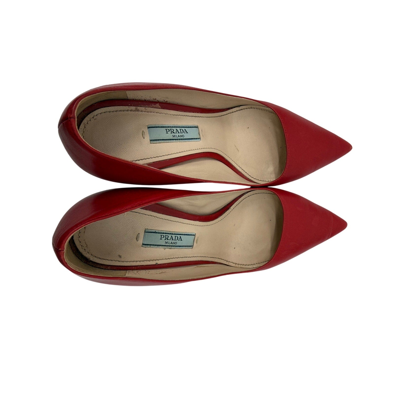 Prada Leather Pointed Toe Pumps Heels showcase sleek leather craftsmanship with a sharp pointed toe for timeless, sophisticated appeal. Designed with a refined heel silhouette, they offer polished elegance perfect for both professional and evening wear.