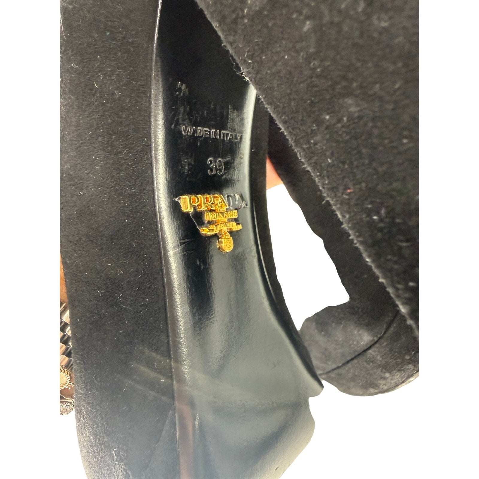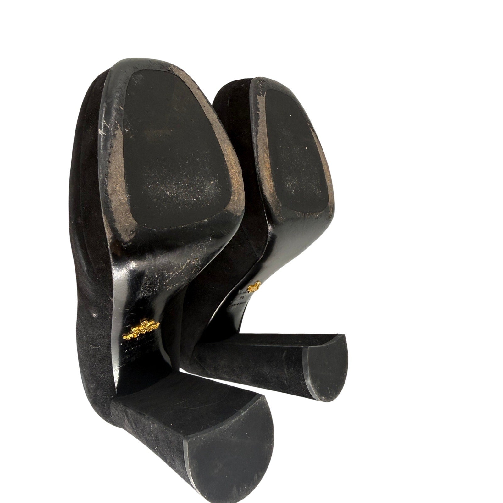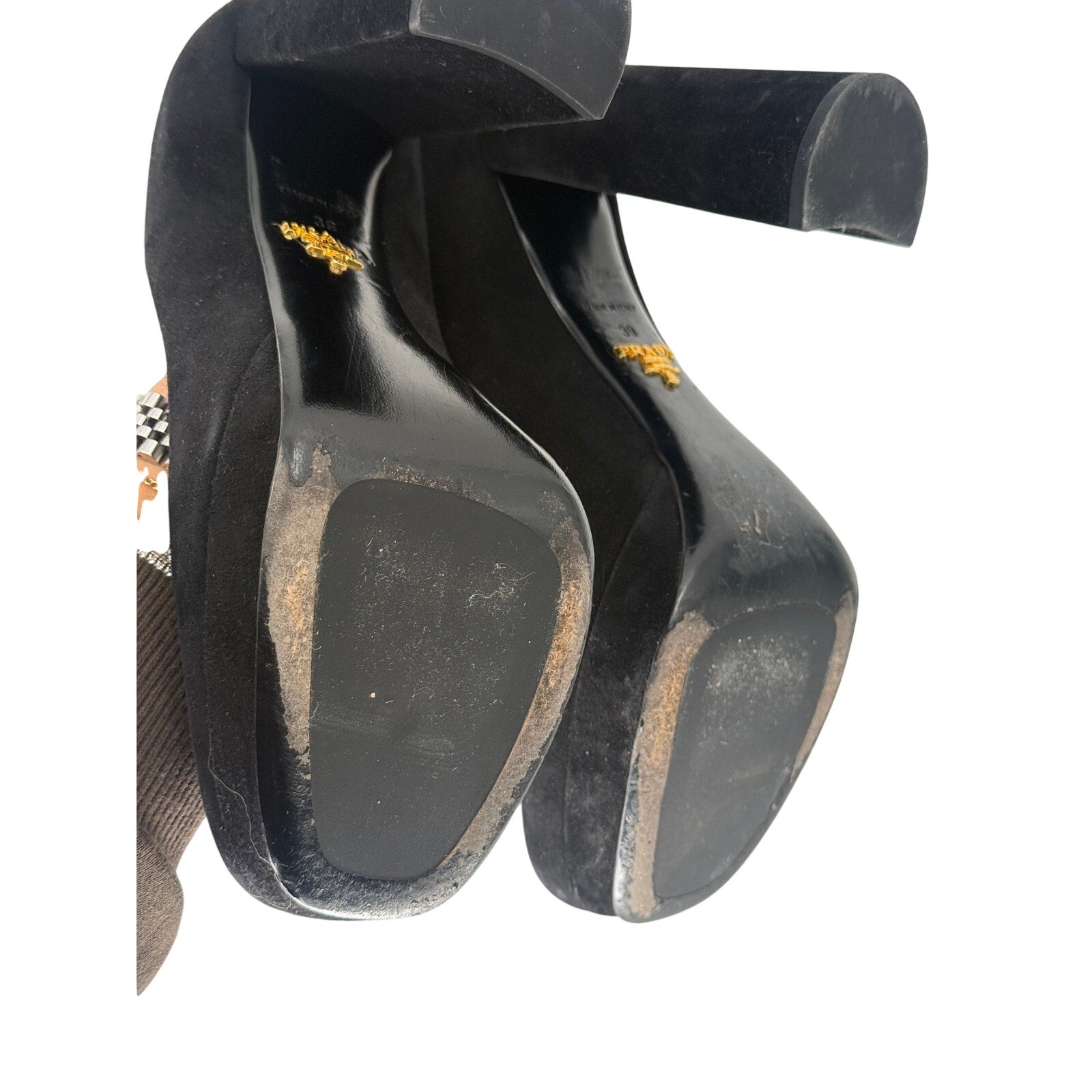 Prada Suede Camoscio Block Heel Platform Pumps feature rich suede construction with a bold platform and sturdy block heel for elevated height and stability. Sleek and sophisticated, they blend retro-inspired charm with modern designer refinement.