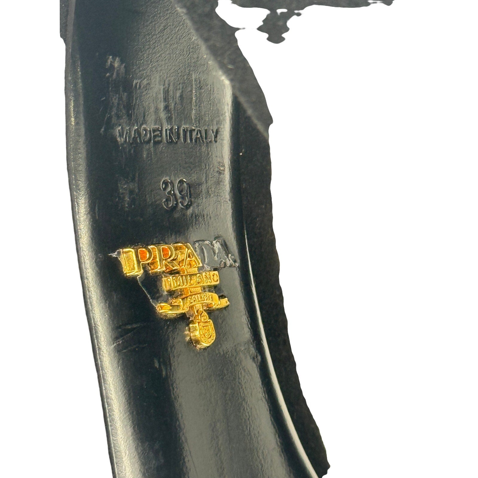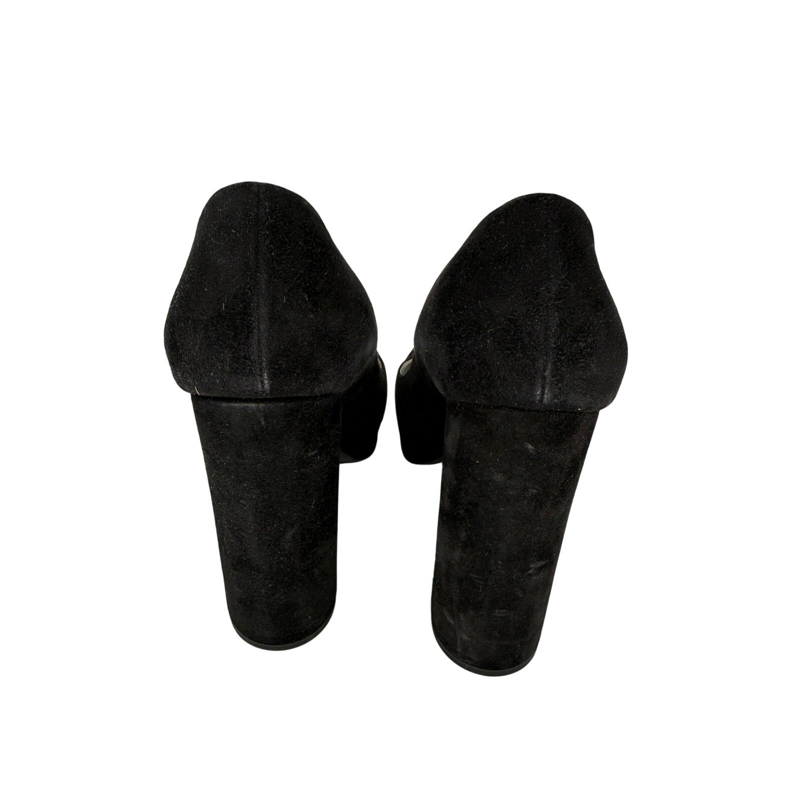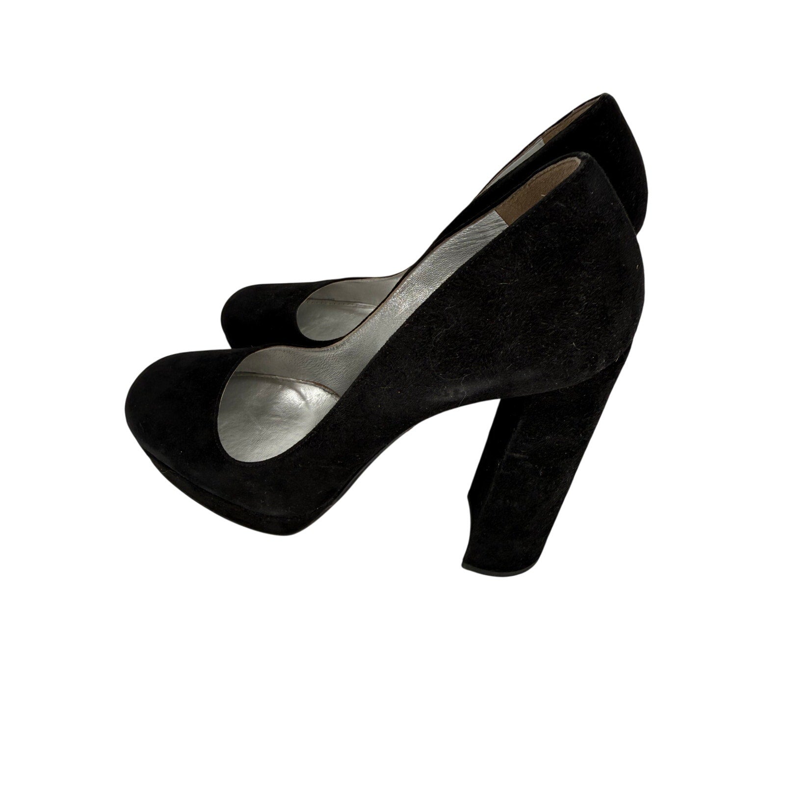 Prada Suede Camoscio Block Heel Platform Pumps feature rich suede construction with a bold platform and sturdy block heel for elevated height and stability. Sleek and sophisticated, they blend retro-inspired charm with modern designer refinement.