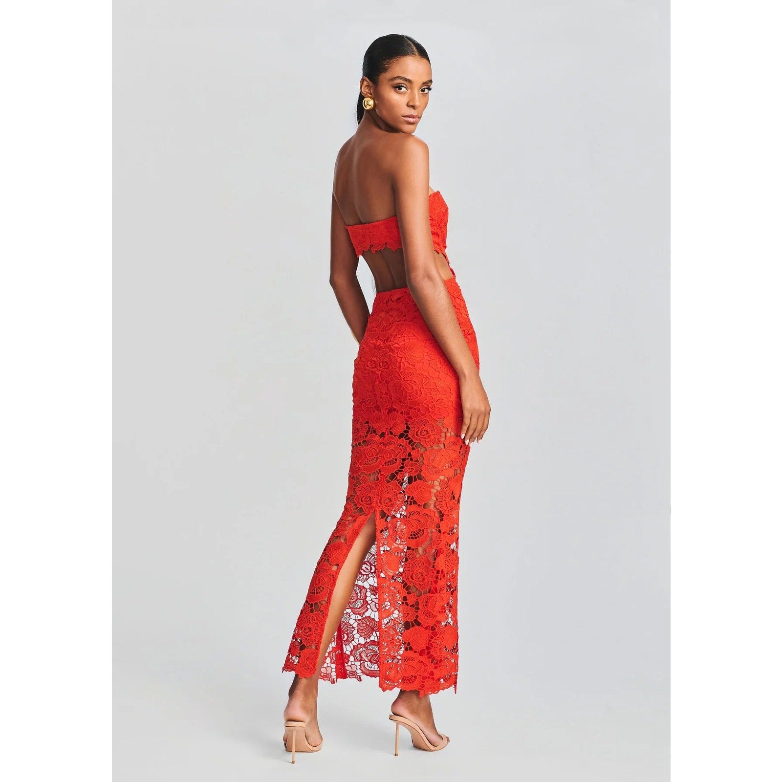 The Retrofête Eliza strapless maxi dress in orange features intricate floral lace and sleek bodycon fit. Its bold color and elegant design make it ideal for standout evening or special occasions.